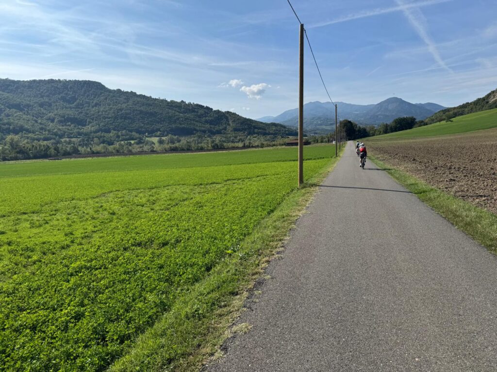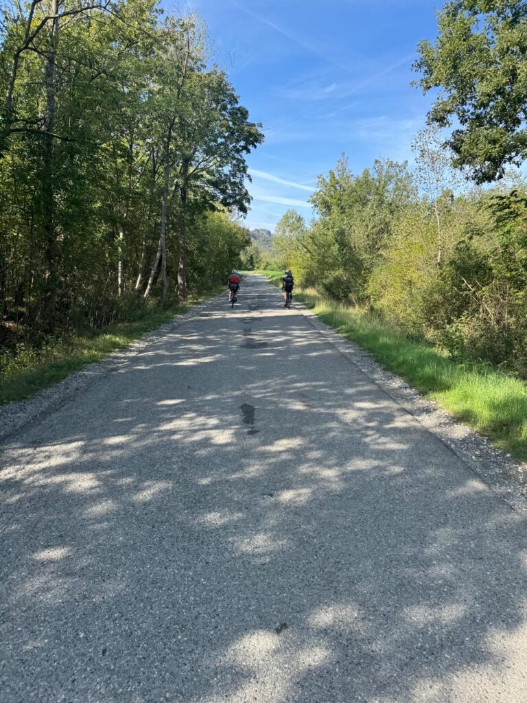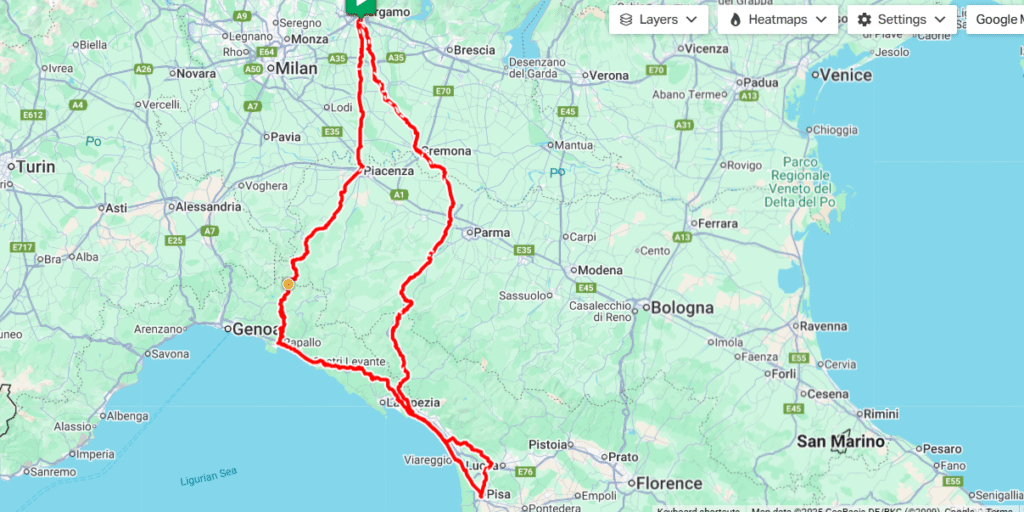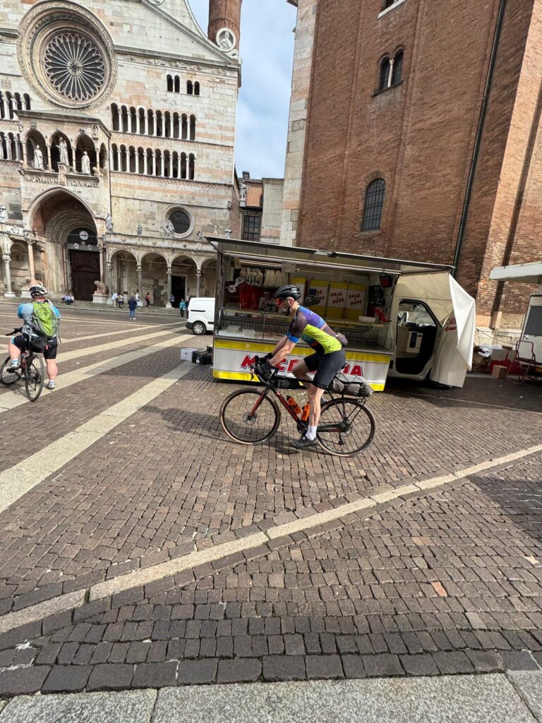 Straight off the plane and into the bike-building circus. The “one-hour job” morphed into two, plus a full bonus lap of Bergamo for no good reason. Eventually we found the right trail and rolled into Piacenza in the dark—ragged but content. Great hotel, even better food.